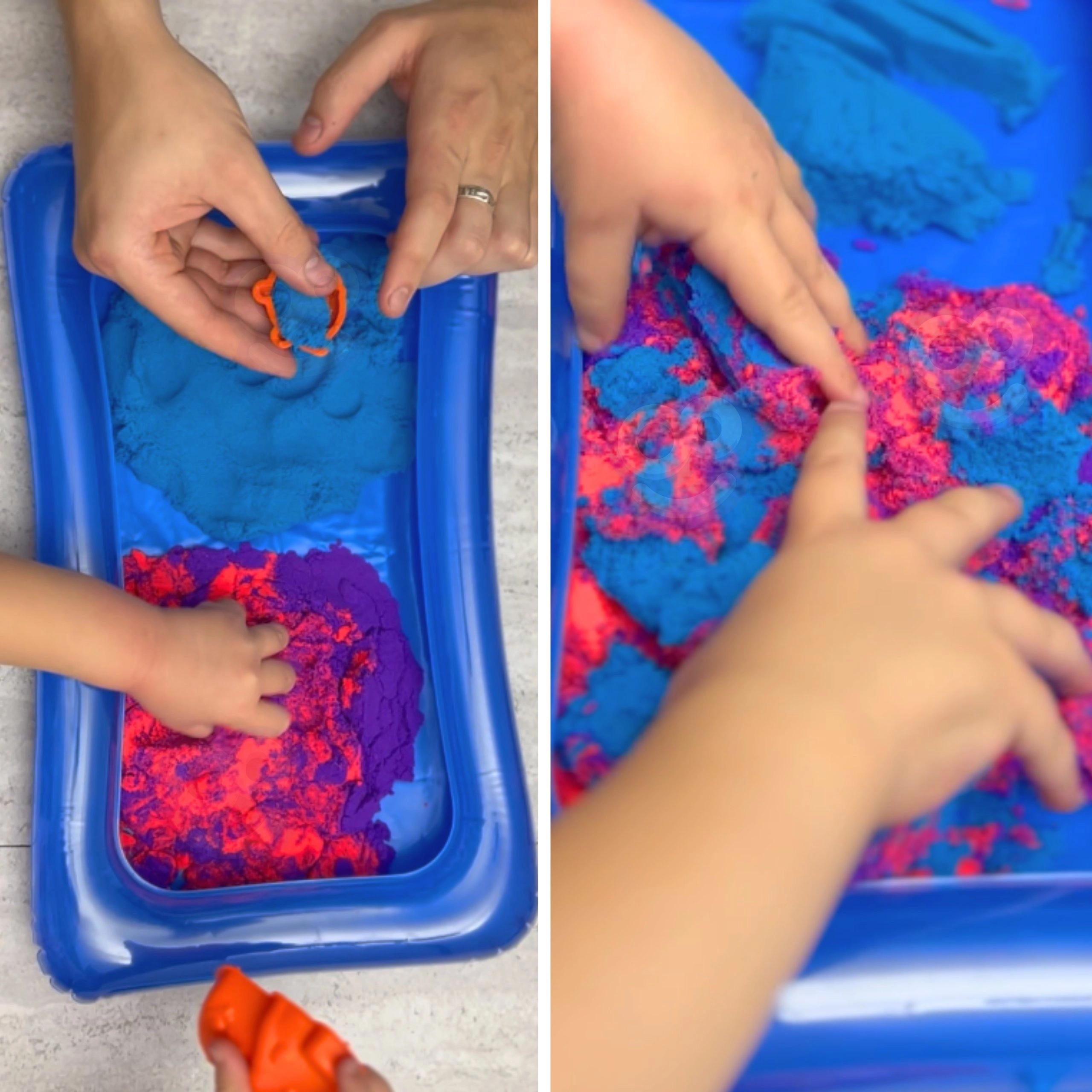 A kompakt, felfújható tálca egyben tartja a homokot, így a gyerekek rendetlenség nélkül alkothatnak a padlón vagy az asztalon.