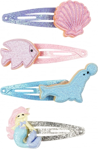 Négy darabból álló csillogó hajcsat készlet tündérmesei sellő, fóka, halacska és kagyló motívumokkal, amelyek varázslatos hangulatot kölcsönöznek a frizurának.