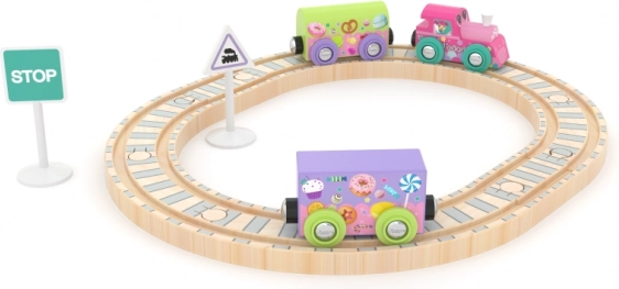 Fa vonatpálya készlet kislányoknak, 15 db. Biztonságos, környezetbarát és kreatív játék 18 hónapos kortól. Fejleszti a fantáziát és a finommotorikát.
