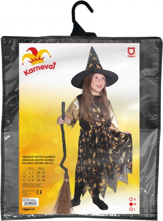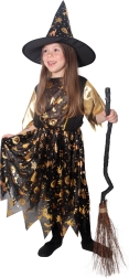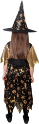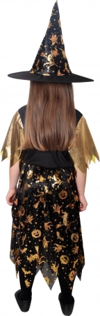 Halloween jelmez kis boszorkányoknak! A fekete-arany színű jelmez ideális 6-8 éves kislányok számára. A arany halloween minták elbűvölővé teszik ezt a ruhát. Része egy tökéletesen összeillő boszorkány kalap is.