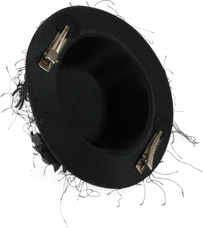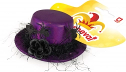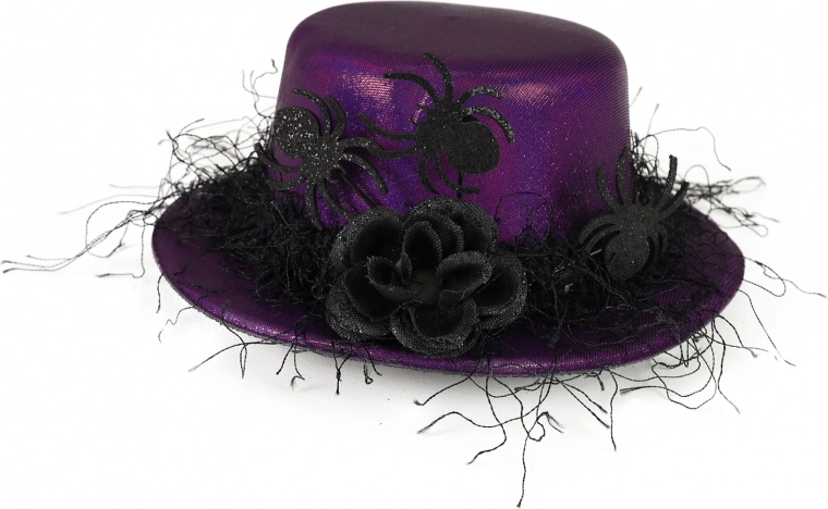 Szerezze be ezt a stílusos mini kalapot, amely eleganciát és egyediséget kölcsönöz. A friss lila szín fekete szalaggal és virággal kombinálva ideális kiegészítő különleges alkalmakra vagy tematikus bulikra.