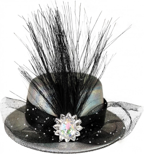 Elegáns ezüst mini kalap fekete szalaggal, tollal és tüllel, ékszerrel díszítve, ami egyedi stílust kölcsönöz frizurádnak. Könnyen rögzíthető két csatos biztonságos hordás érdekében.