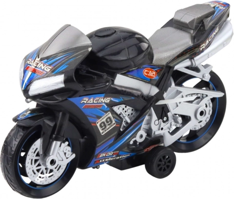 Ez a fekete-kék motor kiváló minőségű műanyagból készült, ellenáll a sérüléseknek, és stabil támasztékkal rendelkező, masszív, széles kerekekkel van felszerelve, ami biztonságos és kényelmes játékot biztosít különféle felületeken. A világítási és hangeffekteket egy gombnyomással aktiválhatjuk - a valósághű motorhangok és fényvillanások lekötik a gyerekek figyelmét, és realista hatást kölcsönöznek a játéknak.