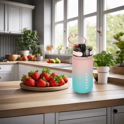 A rózsaszín-kék vizes palack praktikus kiegészítő azok számára, akik követni szeretnék a napi folyadékbevitelüket. A megjelenő infografikus skála segítségével jobban nyomon követheted, mennyi vizet ittál már, és mennyit kell még pótolnod. A maximális térfogat 600 ml, ami megkönnyíti a napi folyadékbeviteled ellenőrzését.