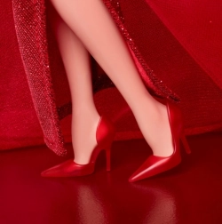 - Rubinvörös magassarkú cipői kiegészítik lenyűgöző megjelenését, arany „M” motívumos fülbevalói pedig a Mattel hagyományos logójára utalnak.