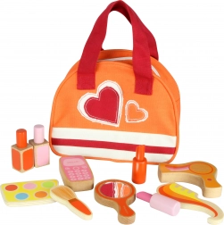 A készlet számos érdekes elemet tartalmaz, amelyek nélkülözhetetlenek a mindennapi stílusteremtéshez: körömlakk, rúzs, hajszárító, hajkefe, szemhéjpúder paletta és ecset, tükör, ecset és még mobiltelefon is. Olyan készlet, amely minden hölgy táskájában vagy kozmetikai táskájában megtalálható!