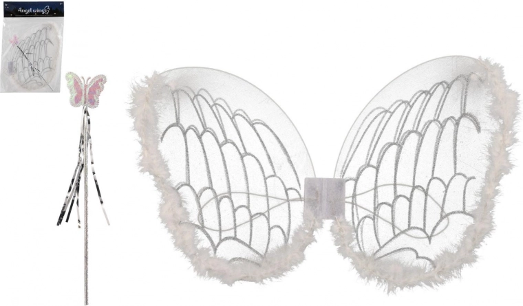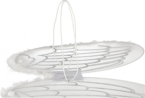 Fehér szárnyak tollas szegéllyel és ezüstös erezettel – látványosak, mégis kényelmesek az elasztikus pántoknak köszönhetően.