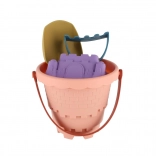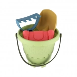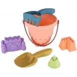 Vödör, lapát, gereblye és három forma a kreatív építéshez és homokformázáshoz egy könnyű készletben.
