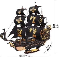 Részletes hadihajó modell fekete-arany vitorlákkal és gazdag díszítésekkel. Minden részlet gondosan kidolgozott, hogy kiemelkedjen és realisztikus megjelenést kölcsönözzön a modelljének.