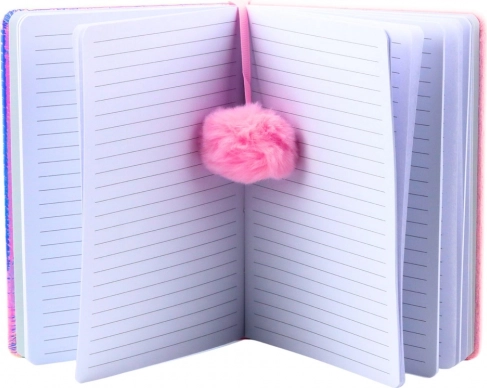 A jegyzetfüzet holografikus borítással és csillámos nyalókával, amely mozgó konfettivel körülvéve színpadra állítja és vidámmá teszi. Az elülső borító felhívja a figyelmet holografikus felületével, míg a hátoldal puha tapintású a plüss anyag révén.
