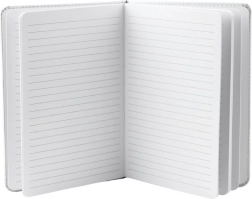 Belsejében 80 sor található napi tervezéshez, naplóíráshoz vagy jegyzeteléshez munkához vagy iskolához. A jegyzetfüzet tartalmaz egy elasztikus gumit a véletlen kinyílás ellen, és egy szalagot praktikus könyvjelzőként.