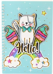 Színes és vidám jegyzetfüzet mesei cicás és egyszarvús motívummal, ami ideális azoknak a gyerekeknek, akik szeretik a képzeletbeli grafikákat és a pasztell színeket. A borítót barátságos cica díszíti masnival és egyszarvú szarvával, amely egy színes szivárványon ül, felhők, fagylaltok és csillagok környezetében. A jegyzetfüzet lágy türkiz tónusú, amely frissességet és pozitív energiát sugároz.