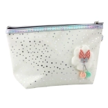 A táska megbízható cipzárral és kényelmes karabineres fogantyúval rendelkezik, ami lehetővé teszi a könnyű rögzítést a hátizsákhoz vagy a csuklón való viselést. Díszítve selyem masnival és pomponnal, amelyek fiús bájt kölcsönöznek, a felület csillámokkal díszített, amelyek fényben ragyognak, ami vonzó és modern megjelenést biztosít.