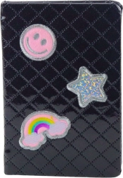B6 formátumú jegyzetfüzet fekete borítással, amelyet védőfólia borít, biztosítva a hosszútávú tartósságot és stílust. A brokát felületkezelés csillag, mosoly és szivárvány alakú felvarrókkal modern megjelenést biztosít.
