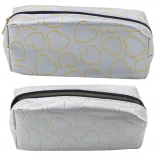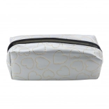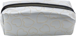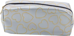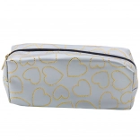 Stílusos és funkcionális tolltartó elegáns ezüst színben arany szívek mintájával, ideális diákoknak és mindenkinek, aki értékeli a praktikus és divatos kiegészítőket.