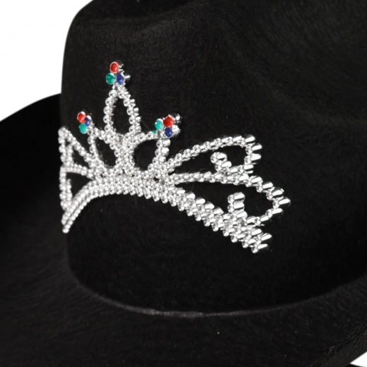 Fekete cowboy kalap hölgyeknek koronával, stílusos és ideális felnőtteknek, magasság 14 cm. Figyelemfelkeltő bármilyen eseményen!