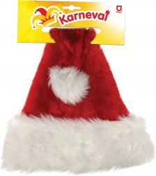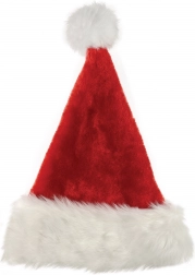 Klasszikus piros karácsonyi sapka fehér szegéllyel és puha plüss anyaggal, ideális kiegészítő a karácsonyi időszakra.