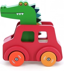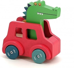 A piros fa autócskának színes kerekei vannak, a krokodil alatt pedig egy kis kürt rejtőzik, amely a fejére nyomva megszólal. Ez az egyszerű mechanizmus serkenti a kisgyermekek kíváncsiságát, miközben közvetlen visszajelzést és interakciót biztosít. Az ergonomikus forma miatt a játék ideális kisgyermekek számára, segíti fejleszteni finommotoros készségeiket, a kéz-szem koordinációt, és támogatja a kreativitást és a képzelőerőt.