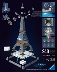 Fedezze fel a kirakók új dimenzióját a RAVENSBURGER 3D puzzle-jével, és készítse el a hű valósághű Eiffel-torony modellt. A minőségi műanyag elemek szilárdan tartanak együtt, így az építéshez nincs szükség ragasztóra. A kész modell stabil, nem deformálódik, és a sima felületnek köszönhetően könnyen letörölhető nedves ruhával.