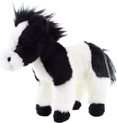 A plüss ló valósághű fekete-fehér mintával rendelkezik, amely autentikus megjelenést kölcsönöz. Puha sörénye és farka erősíti a valósághűséget.