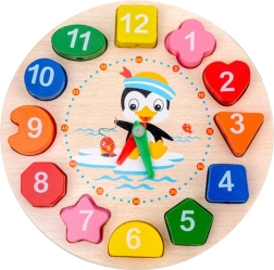 Az órák két mozgatható mutatóval és perc számozással rendelkeznek, amely tanítja a gyerekeket a teljes órás idő felismerésére és finomítja időkezelési képességüket. A számlapon egy vidám pingvin található, ami a legkisebbek figyelmét is felkelti.