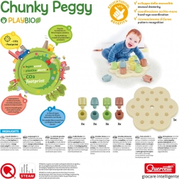 A Chunky Peggy egy színes építőjáték, amelyet a gyermekek motoros készségeinek és a kéz-szem koordináció fejlesztésére terveztek. A fából és műanyagból készült biokompozit anyag használatának köszönhetően ez a játék egyszerre fenntartható és szórakoztató. Amikor elmerül a színek és formák világában:
