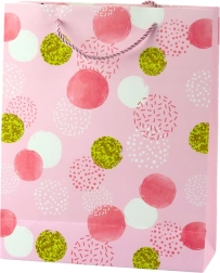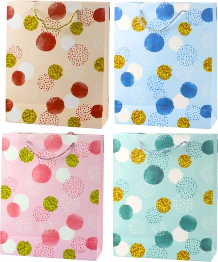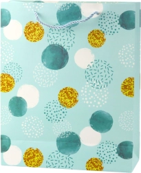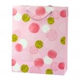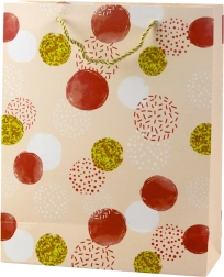 Különböző méretű pöttyök, némelyek csillogó hatással vagy dekoratív nyomattal, eredeti és látványos karaktert adnak az egésznek. A táska tartós, laminált papírból készült, amely ellenáll a gyűrődéseknek, így a nehezebb ajándékok biztonságos csomagolását is lehetővé teszi.
