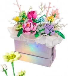 A készlet színes virágkompozíciót kínál stílusos dobozban, ami ötvözi a természetes csokrok látványát az alkotás örömével. A fémes hatású doboz és a textil díszítő anyag kiegészíti az összképet, és varázslatos ajándékot teremt.