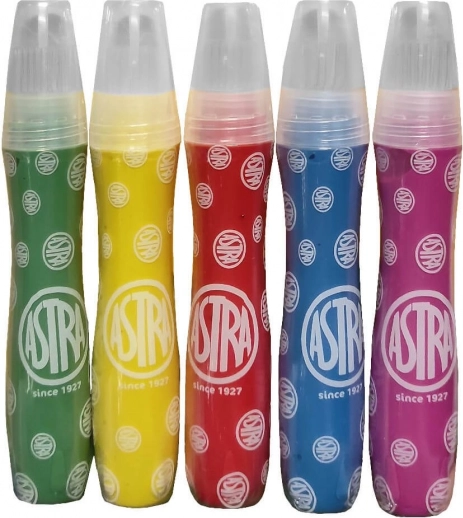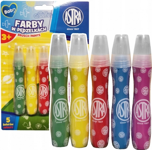 Ideális készlet kis művészeknek: ASTRA festékecsetekben, 5 db. Minden ecset már tartalmaz festéket, így nincs szükség további eszközökre. Könnyű használat nyomással, biztonságos összetétel és 3 éves kortól gyermekeknek tervezve – kiváló papírhoz és kartonhoz.