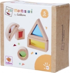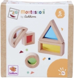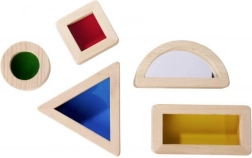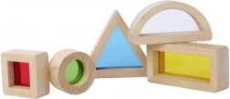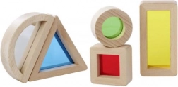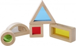 A különböző formájú kockák kísérletezésre ösztönöznek fénnyel, színekkel és formákkal. A gyerekek a színes lencséken keresztül figyelhetik a világot, keverhetik a színeket vagy felfedezhetik magukat a tükröződő hatásban. A masszív bükkfa gondos megmunkálása kellemes tapintást és hosszú élettartamot garantál.