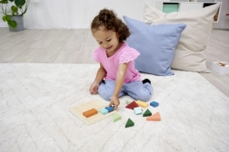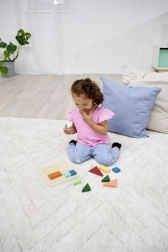 Ez a Montessori kirakó szórakoztató kihívást kínál a gyerekeknek: különböző formákat kell úgy összeilleszteni, hogy kitöltsék a négyzet felületét. Az elemeket szabadon lehet keverni a négyzetek között, új színkombinációkat létrehozva, ami meghosszabbítja a játékélményt és serkenti a kreativitást.