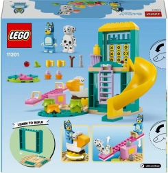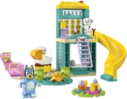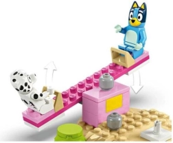 Ez a játékos, játszótéri témájú építőkészlet rengeteg lehetőséget kínál a szabad játékra és építésre 4 éves kortól. A két figura – Bluey és Foltos – lecsúszhat a sárga csúszdán, hintázhat, játszhat a rózsaszín billenő hintán, felmászhat a létrán és a teleszkóppal a toronyból figyelheti a környéket. Van egy kerek platform játékelemekkel, mini piknik csészékkel és cupcake-ekkel, valamint kis növények, amelyeken át lehet ugrálni.