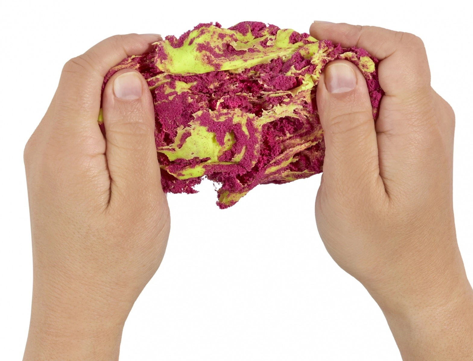 Két kontrasztos textúra élénk színekben – sima, rugalmas gyurma és strukturált homok a végtelen formázáshoz és szenzoros játékhoz.