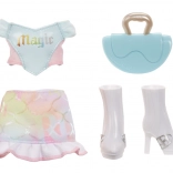 Összehangolt top, szoknya, kézitáska és cipő alkotják az ikonikus, színes megjelenést, amely minden divatjátékban magára vonja a figyelmet.