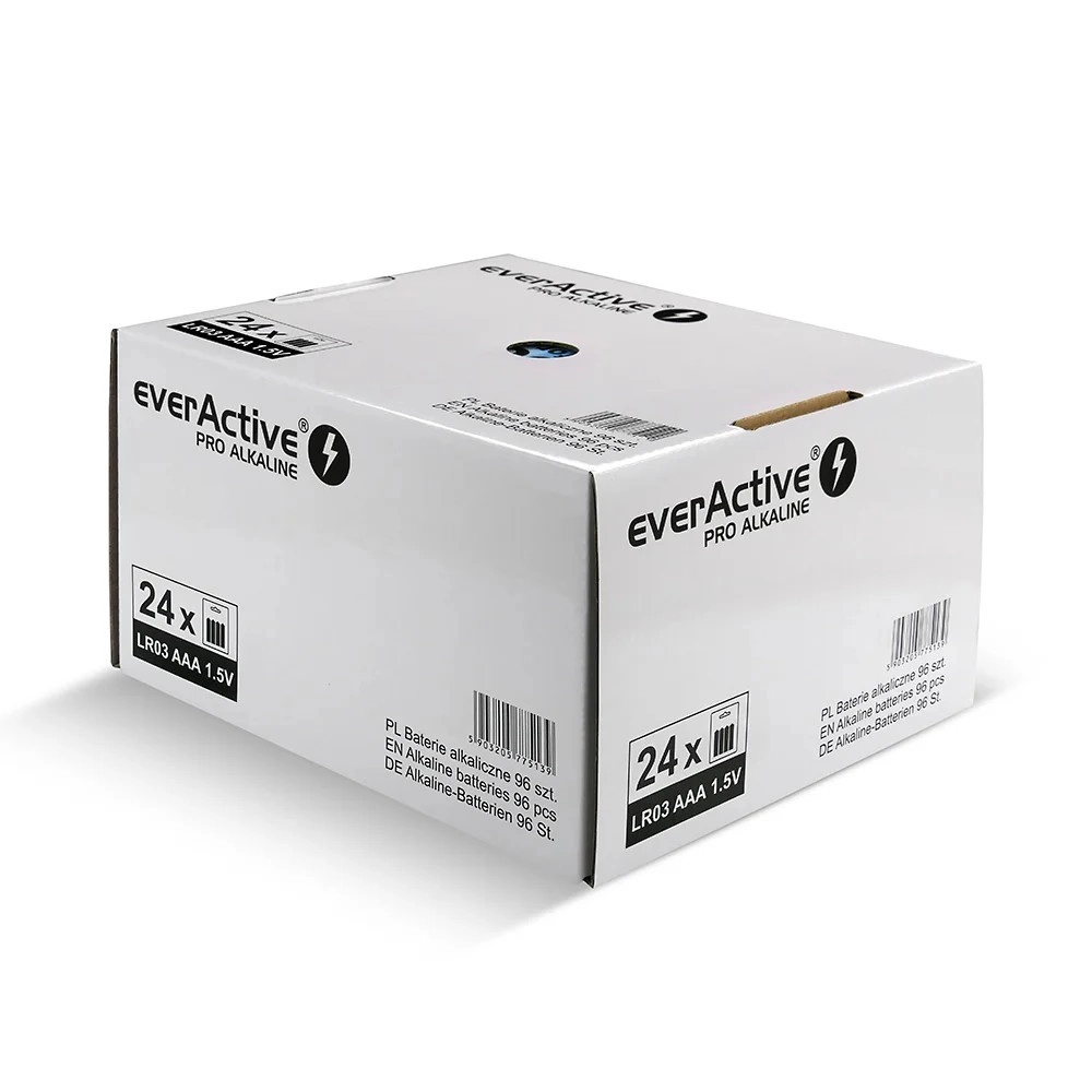Kedvező kiszerelésű AAA (LR03) EVERACTIVE PRO alkáli elemek praktikus üzleti displayben, összesen 96 darabbal. Ideális kiskereskedelemhez, szervizpontokhoz és cégekhez a megbízható teljesítménynek, a hosszú élettartamnak és az áttekinthető eladási csomagolásnak köszönhetően.