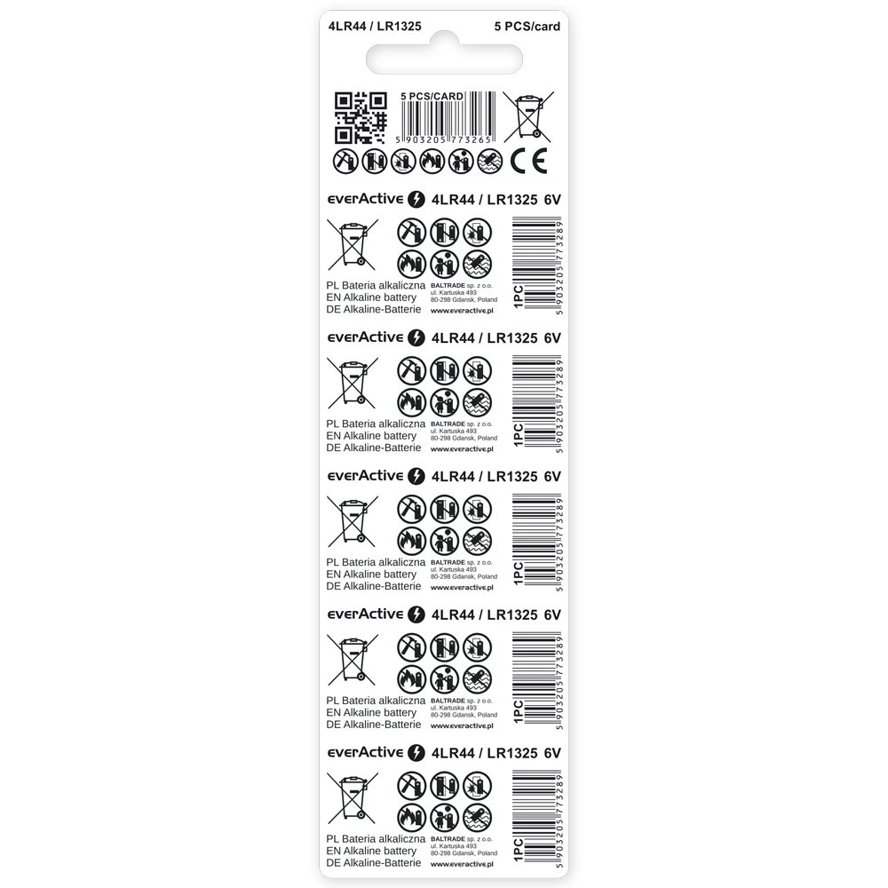 Az everActive LR44 / LR1325 / 544A alkáli elemei mindennapos használatra készültek kis méretű elektronikában. Stabil feszültségüknek köszönhetően biztos működést és hosszú élettartamot nyújtanak gyakori csere nélkül. Az 5 darabos praktikus csomag mindig jól jön kéznél.