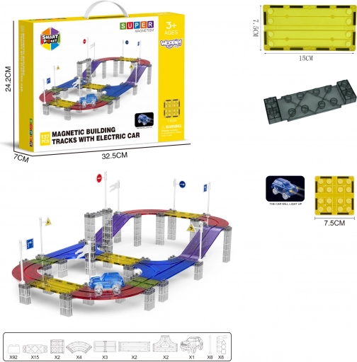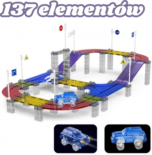 Woopie mágneses versenypálya LED-es kisautóval, 137 elem. Könnyű összekapcsolás, többszintű pályák, fényhatások. Kreatív szórakozás 3 éves kortól.