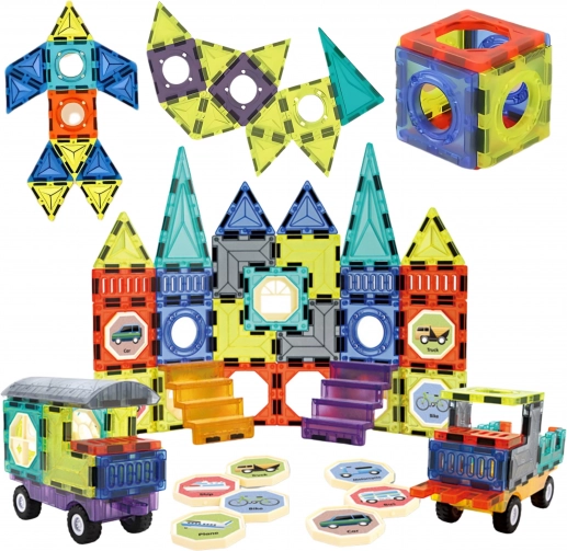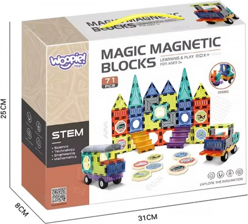 WOOPIE 3D mágneses kockák, 71 darab. Építs kastélyokat és járműveket, erős mágnesekkel, színes elemekkel és matricákkal. Kreativitás és logika fejlesztése 3 éves kortól.