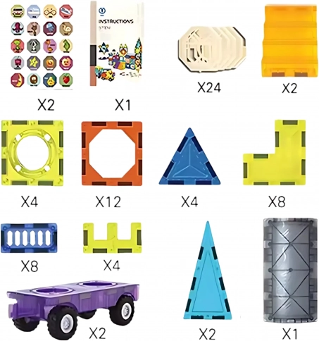 - 4× négyzet nyílásokkal, 12× nyolcszög, 4× háromszög, 8× L alakú elem, 24× kártya matricákkal/képekkel, 2× hosszúkás téglalap („tégla”), 8× rácsos négyzet, 4× háromszög félkörrel (lépcső), 2× kerekes alváz, 2× magas háromszög (torony), 1× henger (tető), 2× matricalap, 1× útmutató/STEAM kalauz
