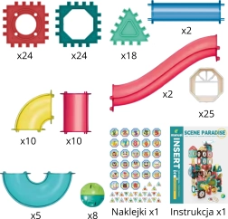 A nagy, 128 darabos készlet sokféle formát és színt kínál egyszerűbb és haladó projektekhez. Az átlátszó elemek lehetővé teszik a golyók mozgásának megfigyelését, és szemléletesen magyarázzák a sebesség, gravitáció és tehetetlenség törvényeit. A játék fejleszti a kreativitást, a türelmet és a műszaki készségeket.