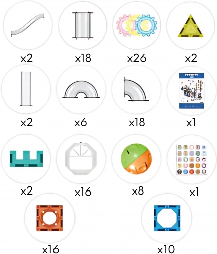 - Átlátszó elemek és pályakomponensek (rámpák, kanyarok, csövek) a golyók mozgásának szemléletes követéséhez.