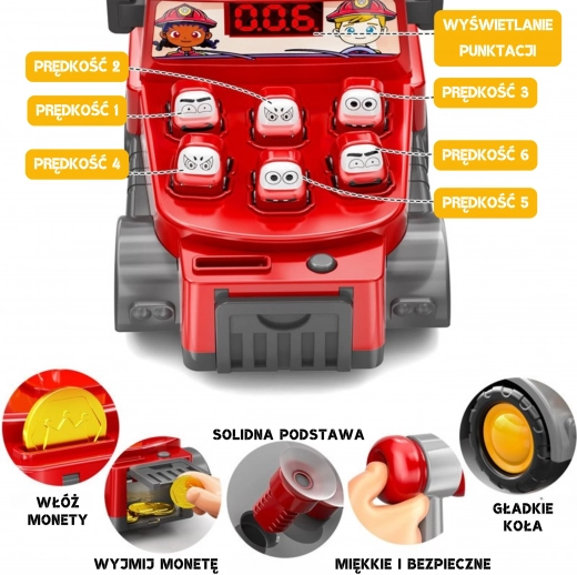 A WOOPIE márka szórakoztató 2 az 1-ben tűzoltóautója ötvözi a dinamikus „Üsd a vakondot” játékot egy guruló kisautóval. Csak dobj be egy érmét, vedd kézbe a puha kalapácsot, és gyűjts pontokat a kis piros autók formájú „vakondok” eltalálásával. A színes dizájn, a strapabíró kialakítás, a 6 sebességfokozat, a 3 nehézségi szint és a biztonságos, lekerekített elemek órákon át tartó aktív és kreatív szórakozást biztosítanak a gyerekeknek.