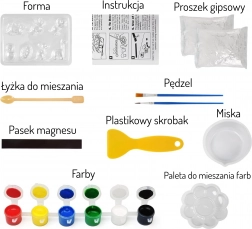 - Minden a csomagban: formák, gipsz, tál, kanál, paletta, 6 szín, ecset, spatula, útmutató
