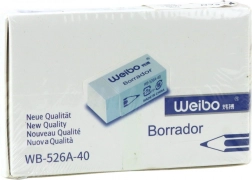 A praktikus, fehér WEIBO radír nélkülözhetetlen segédeszköz iskolába és irodába. Minőségi, puha anyagának köszönhetően tiszta és hatékony radírozást biztosít elkenődés nélkül, és nem sérti a papírt. Kompakt 3,5 × 2 × 1 cm-es méretének hála bármely tolltartóba vagy fiókba belefér, és latexmentes.