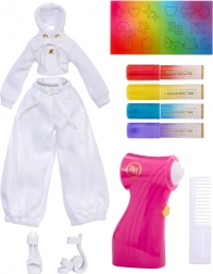 Ez a kreatív baba olyan, mint egy üres vászon – teljesen fehér, fehér hajjal és olyan öltözettel, amely készen áll a fantáziádra. A csomagban négy mosható, szivárványos filctollat találsz (piros, sárga, kék, lila) és egy praktikus airbrusht az egyszerű árnyékoláshoz és az egyenletes színfelvitelhez.