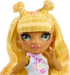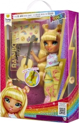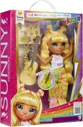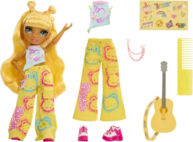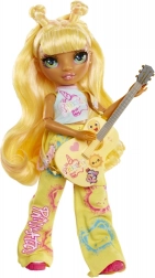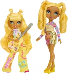 Sunny a Rainbow High Junior Fashion kollekcióból főgitárosként ragyog – hosszú sárga hajjal, részletgazdag sminkkel és rugalmas ízületekkel a valósághű pózokhoz. A szett tartalmaz egy feltűnő mintákkal díszített öltözéket, stílusos tornacipőt, fésűt és sárga gitárt mókás matricákkal, hogy a gyerekek saját ízlésükre formálhassák a megjelenést.