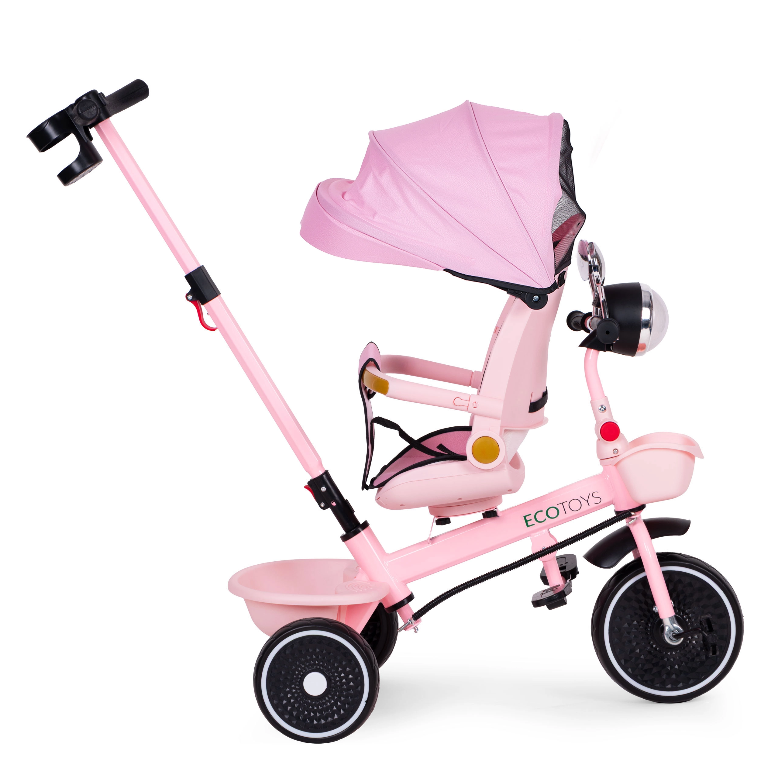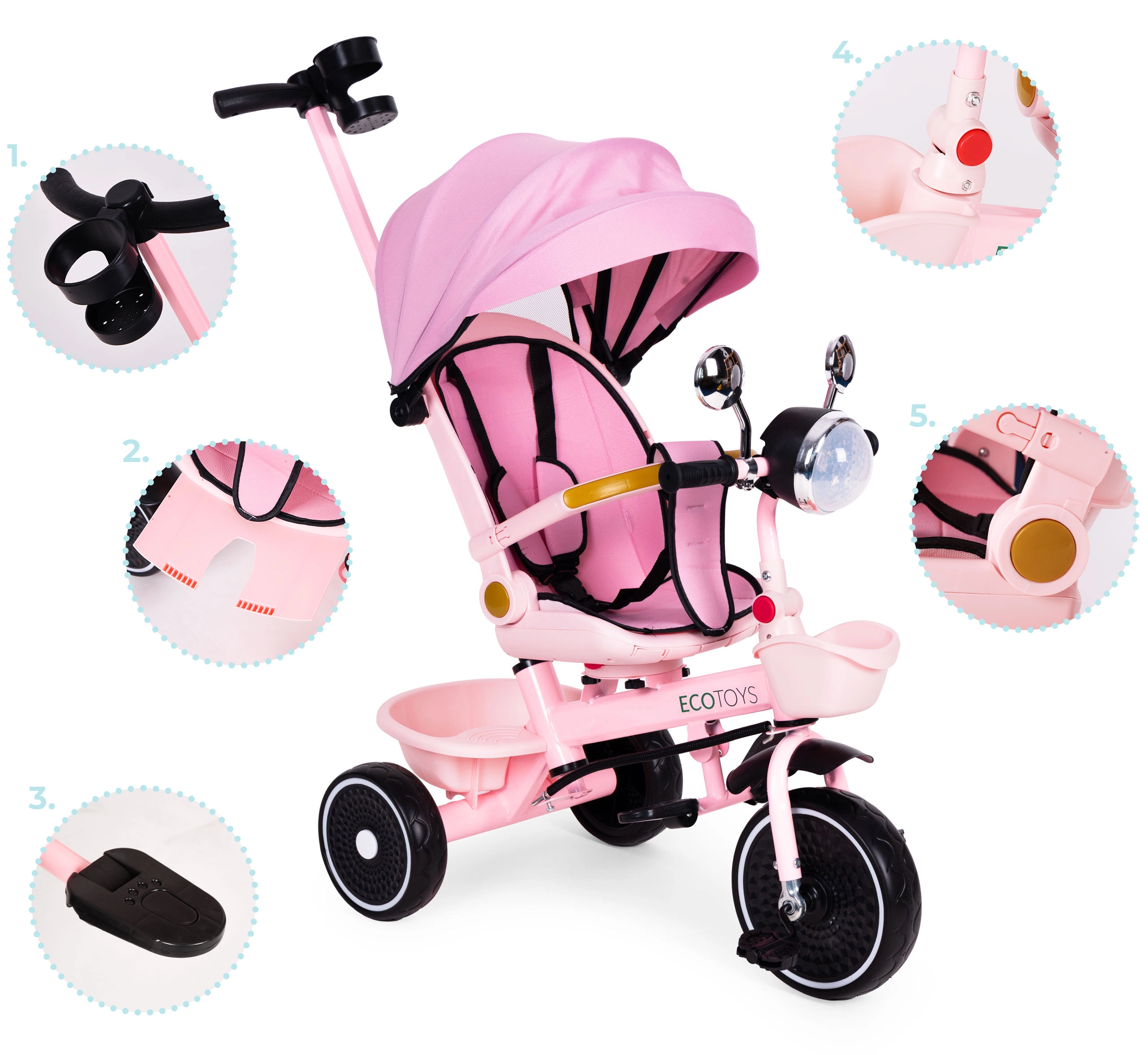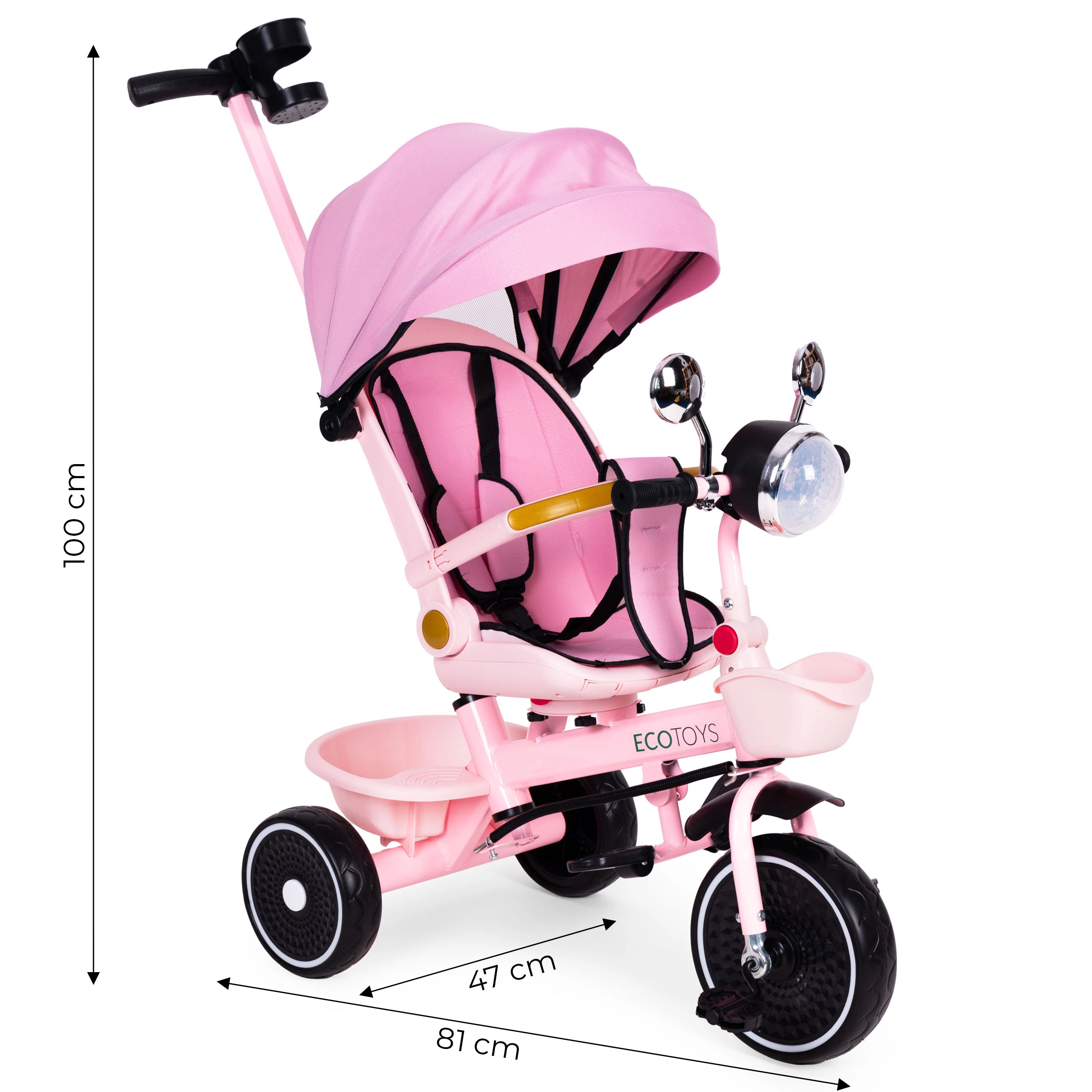 Stílusos rózsaszín ECOTOYS háromkerekű babakocsi, amely ötvözi a babakocsi kényelmét és a tricikli vezetésének örömét. Kínál 360°-ban forgatható ülést, szülői vezetőrudat elsőkerék-kormányzással, összecsukható napellenzőt, ötpontos biztonsági övet és tartós EVA kerekeket a sima és biztonságos utazáshoz 6 hónapostól 6 éves korig.