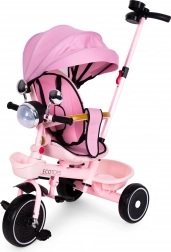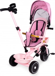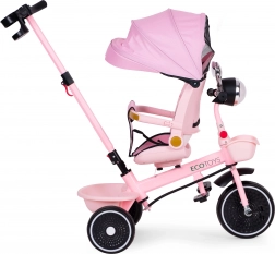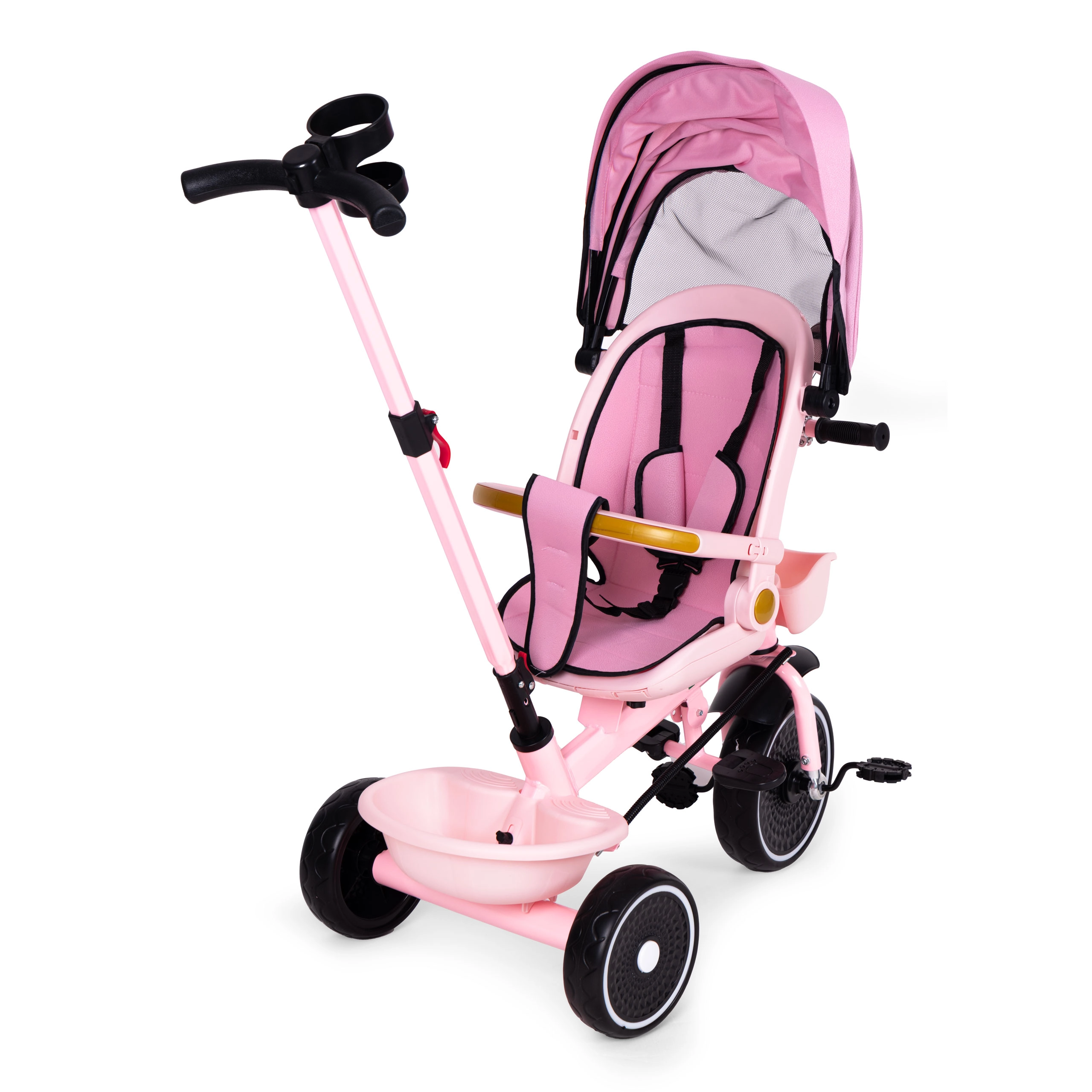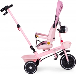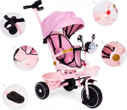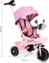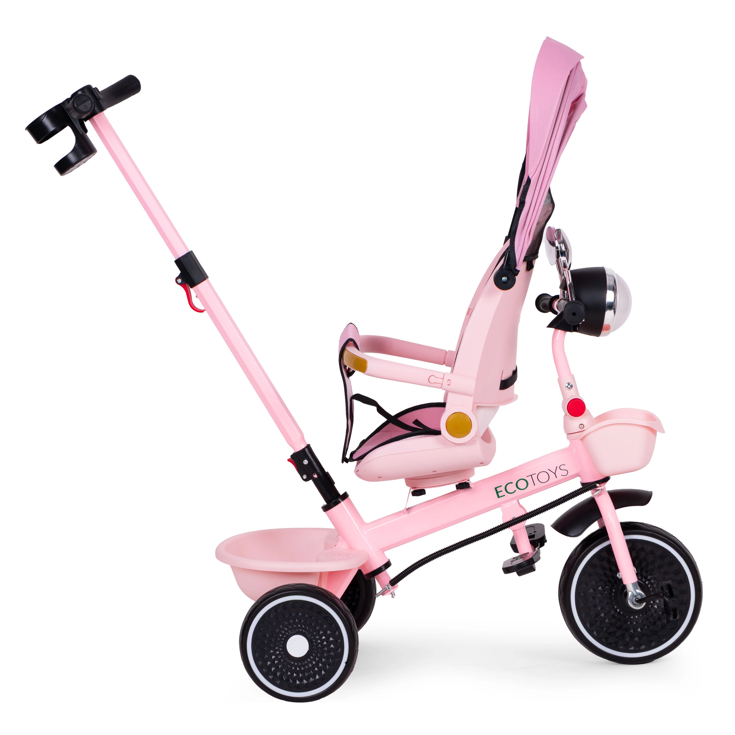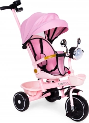 Stílusos rózsaszín ECOTOYS háromkerekű babakocsi, amely ötvözi a babakocsi kényelmét és a tricikli vezetésének örömét. Kínál 360°-ban forgatható ülést, szülői vezetőrudat elsőkerék-kormányzással, összecsukható napellenzőt, ötpontos biztonsági övet és tartós EVA kerekeket a sima és biztonságos utazáshoz 6 hónapostól 6 éves korig.