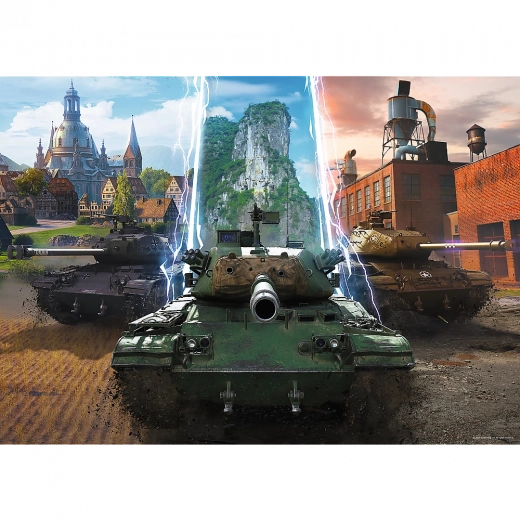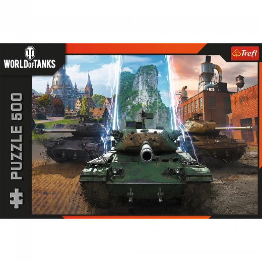 500 darabos WORLD OF TANKS: Irány az akció! puzzle a Trefltől. Méret 48×34 cm, élénk színek, kalanderezett papír, környezetbarát festékek. 3 éves kortól.