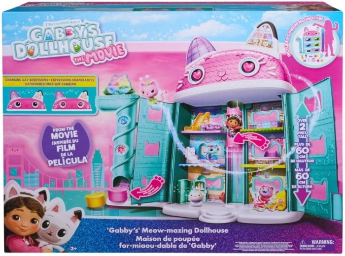 A GABBY'S DOLLHOUSE nagy cicaháza hat szobával, elforgatható tetővel és titkos padlással hívja játékra a gyerekeket, rengeteg játéklehetőséggel. A működő Cat‑A‑Vator (lift) segítségével a figurák könnyedén közlekednek az emeletek között, új jeleneteket és meglepetéseket felfedezve.